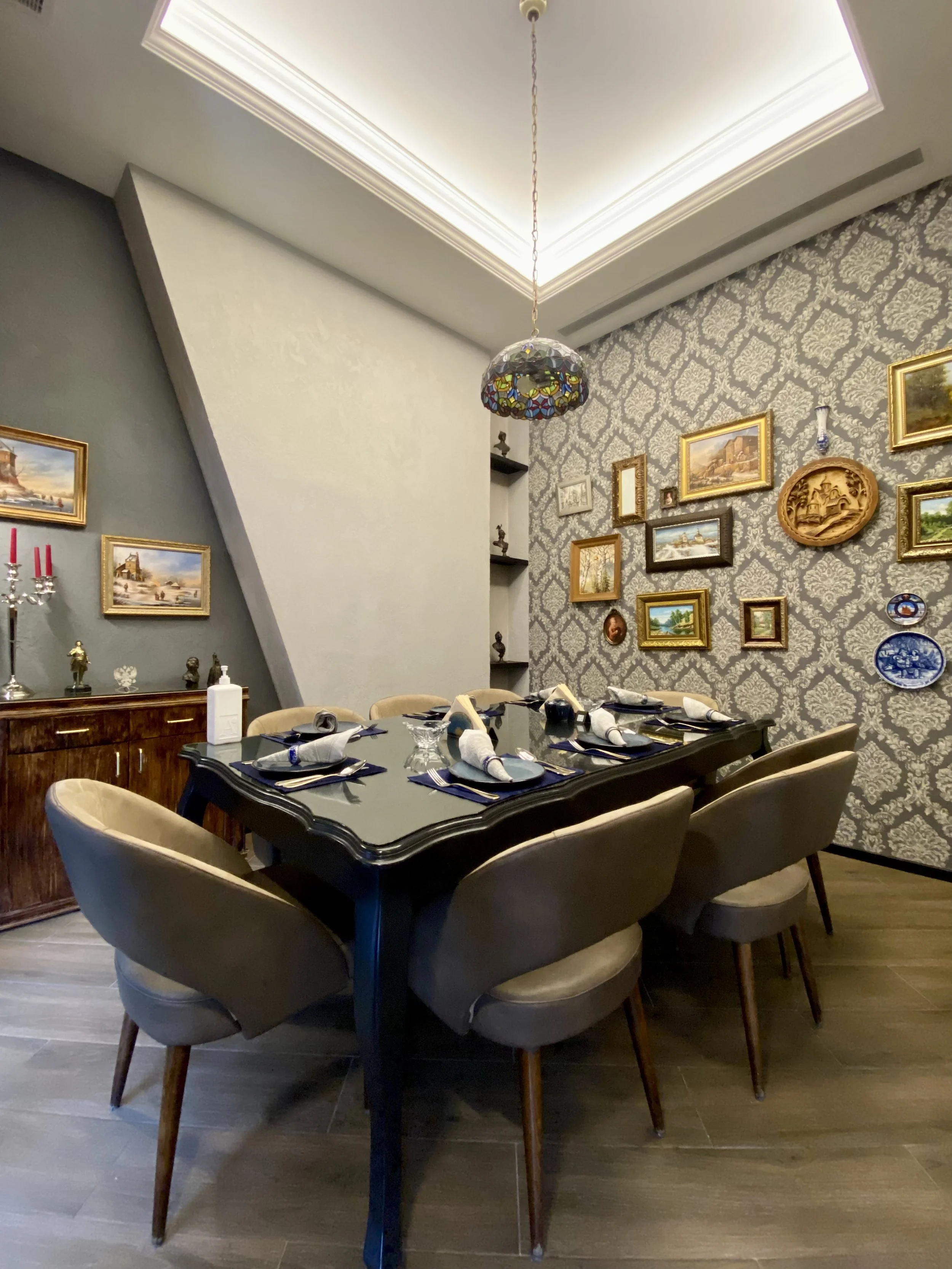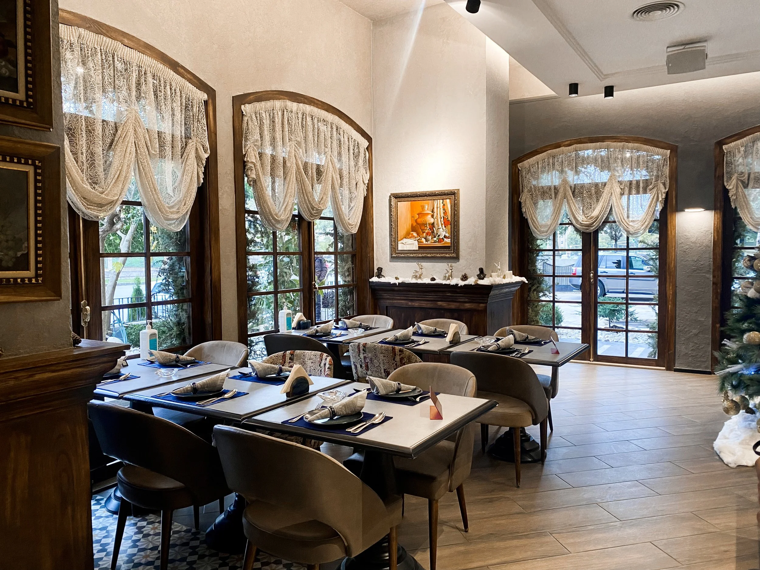 Our design approach is centered on celebrating Russian culture through meticulous attention to detail. From wooden craftsmanship to traditional curtains, navy blue table dressing, and warm lighting fixtures, each element adds depth and character to the space. Traditional wallpapers and decorations serve as a backdrop, further immersing guests in the enchanting ambiance of Russian hospitality.